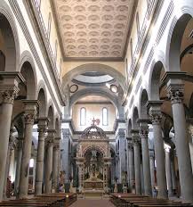 4/12 We started the day at Santo Spirito. This was Brunelleschi's last commission. The ceiling has unconvincing tromp l'oeil coffers. Worse, there's a large altar at the crossing that damages the interior space: